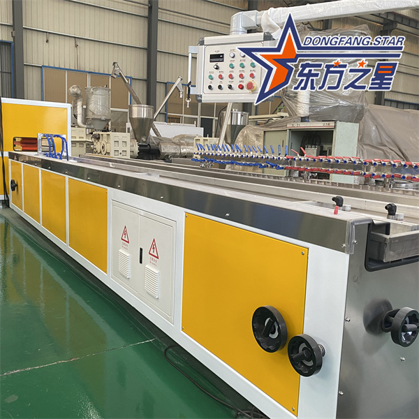 PVC trä-plast kompositpanelutrustning är en automatiserad produktionslinje som använder PVC-harts och träpulver/bambupulver som råmaterial. Genom blandning, smältextrudering och vakuumformningsprocesser producerar den trä-fibrer kompositpaneler. Kärnkomponenterna inkluderar en konisk dubbelskruvextruder, specialiserade formar, ett vakuumformningsbord, en dragmaskin och en skärmaskin.