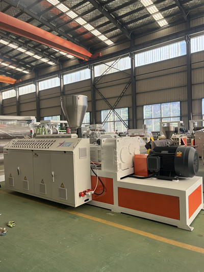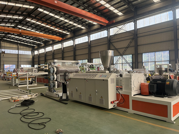 Princip: PVC -premixet matas in i extrudern, uppvärmd och skjuvad av skruven och extruderas sedan genom en platt matris i ett ark. Arket kyls sedan, ställs in och skärs.