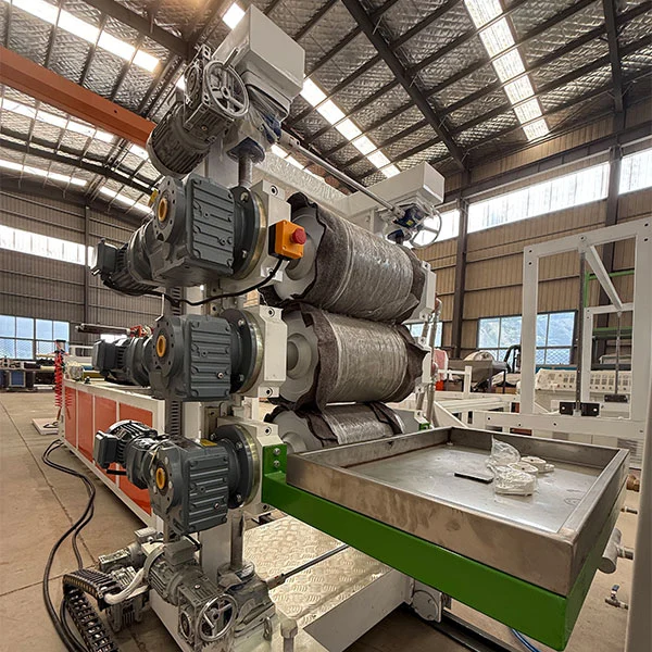 TPU-arkformen använder ett krompläterat, spegelfiniserat T-Die-huvud. Flödesvägsdesignen är symmetrisk och smidig, utan döda fläckar, vilket säkerställer enhetlig smältfördelning. Die Lip Gap är finsmetig (med en noggrannhet på 0,01 mm), med rymdtjocklekar från 0,1 till 5 mm. TPU-ark Extruder-maskinen är utrustad med en tre-rullskylning och formningsenhet. Rullytan är spegelpolerad och kylvattentemperaturen styrs av ett konstant temperatursystem. Detta möjliggör snabb kylning och formning samtidigt som man säkerställer en slät, skrapfri yta. Plathet och tjocklekstolerans för arket (inom ± 0,03 mm) styrs av trycket mellan rullarna.